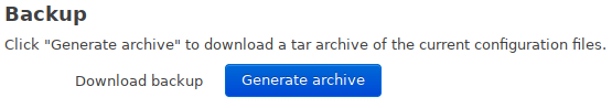 - l’interface d’administration, menu ‘System’ > ‘Backup / Flash Firmware’ puis dans la section Backup cliquez sur le bouton [ Generate archive ].