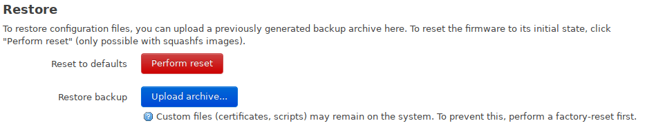 - [ Perform reset ] qui aura pour propos de remettre à la configuration initiale du firmware - nécessite que celui-ci soit de type “squashfs”