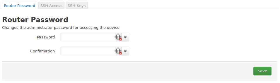 passwd - par l’interface d’administration LuCI - si elle est installée - : menu ‘System’ > ‘Administration’, onglet ‘Router Password’ - onglet par défaut.