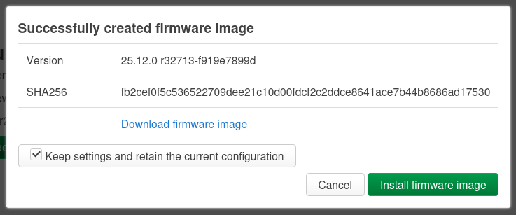 Attented Sysupgrade : Sélection d’une nouvelle image disponible - Une nouvelle fenêtre avertissant du succès de la création de l’image du micrologiciel